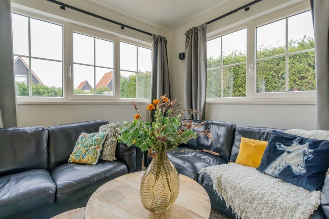 - Tuingerichte woonkamer met veel raampartijen, veel lichtinval en voorbereiding voor een gaskachel