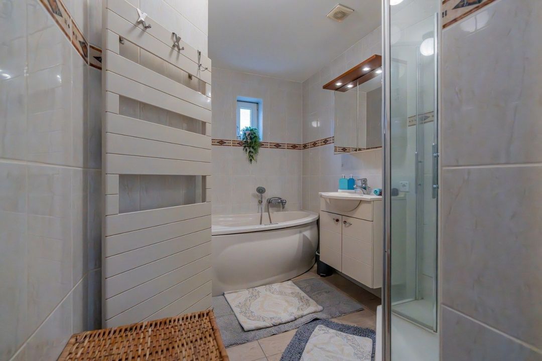 - Geheel betegelde badkamer met ligbad (whirlpool), wastafelmeubel en douchecabine